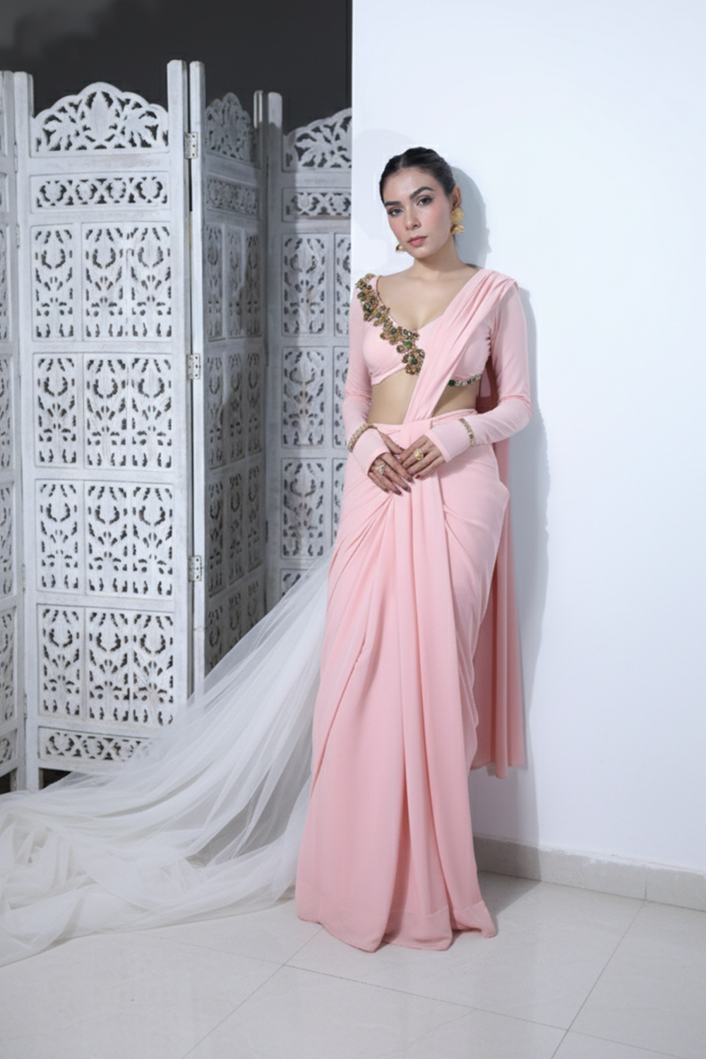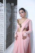 Dramatic pink fabric draped in a sculpted silhouette. Structured full- sleeve blouse with metallic finish, clean neckline, and metal detailing. This is a bold and glamorous saree perfect for a cocktail or fashion-forward evening event.