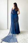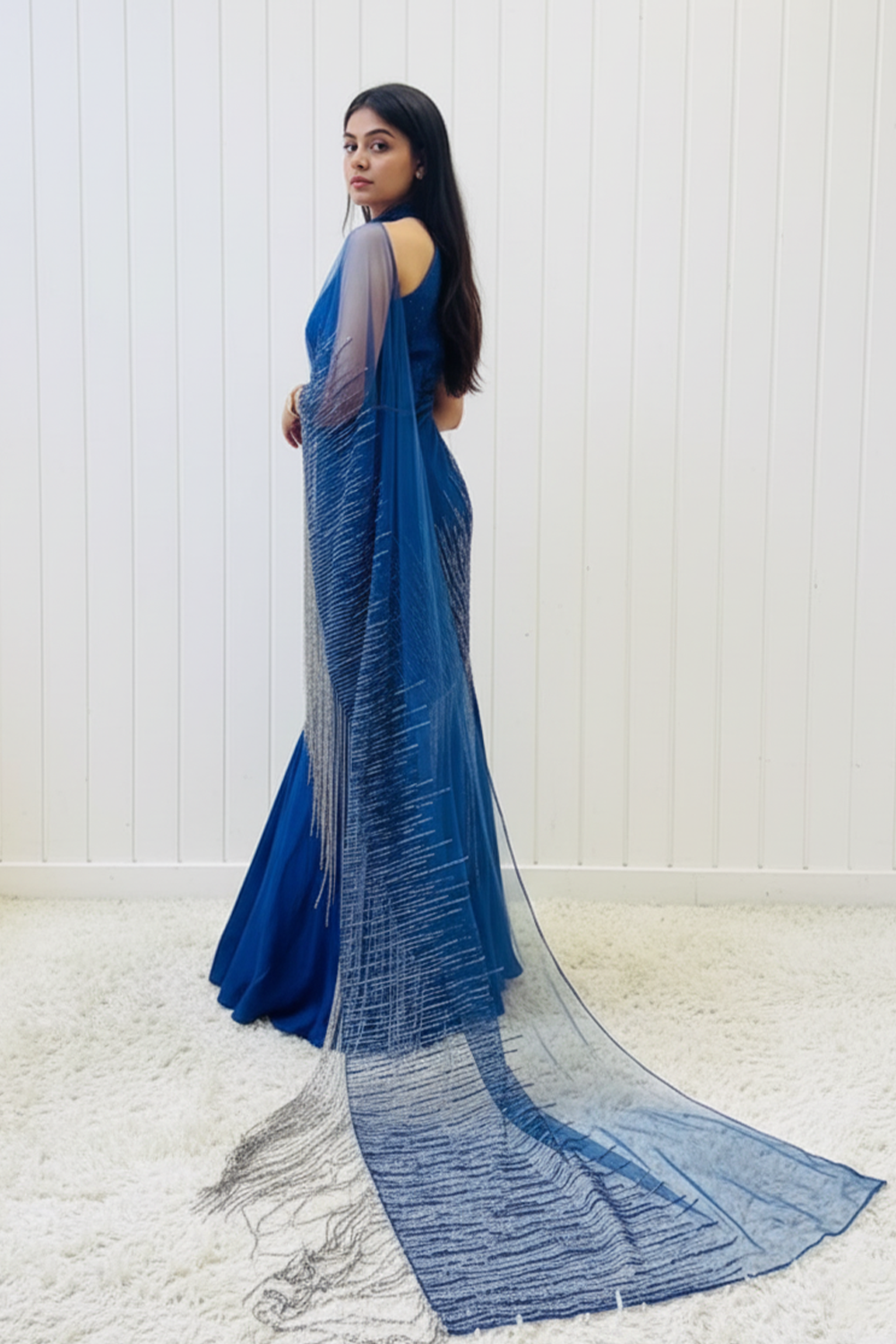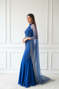 Elevate your style with our exquisite royal blue fish-cut skirt and top adorned with delicate handwork. this stunning ensemble is complemented by an embellished drape, adding a touch of regal elegance to any occasion.
