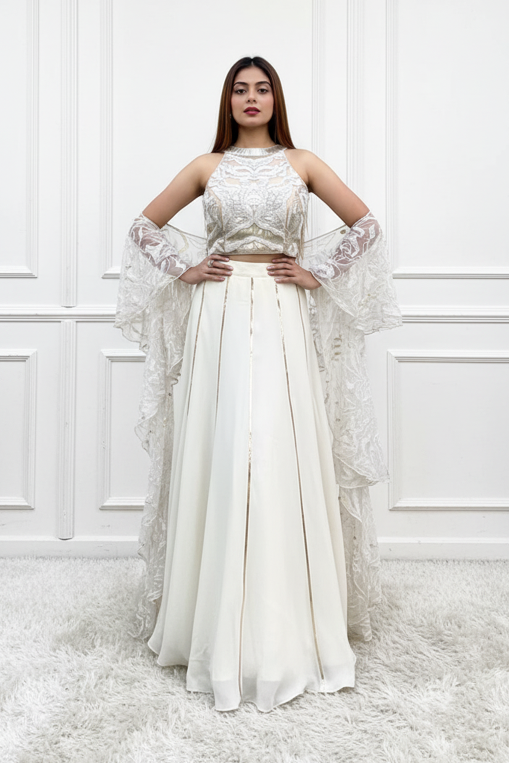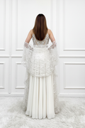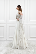 Dive into opulent elegance with our ivory lehenga set.crafted with intricate detailing and an embellished blouse with a mesmerizing ruffle dupatta that adds a playful yet regal touch, completing your look with a flourish.