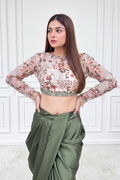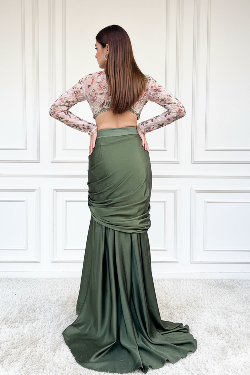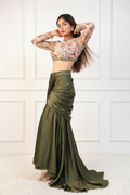 Step into the spotlight with our show-stopping olive green asymmetrical mermaid skirt, perfectly paired with a hand-embroidered top.this ensemble is a fusion of modern flair and timeless elegance, guaranteed to turn heads and leave a lasting impression wherever you go.