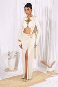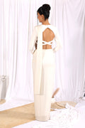 Soft, luminous, and ethereal—this ivory shimmer saree is understated opulence. Paired with a clean matte full sleeve blouse adorned in gold-toned metallic work-along with crystals in the centre which makes it perfect for both modern brides and minimalists who want to shine.