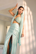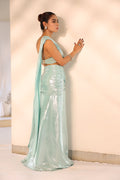 Flowing sea-blue shimmer saree with soft pleats and contemporary drape. Blouse is a strap-style crystal and pearl embellished blouse. This saree exudes understated elegance with a dreamy, ethereal twist.
