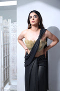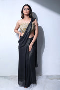 Look ravishing, hot in this black shimmer georgette saree with an embellished lotus blouse.Crafted to perfection, this ensemble is a fusion of tradition and contemporary flair.
